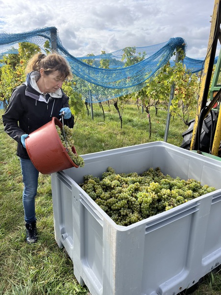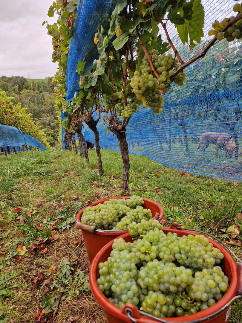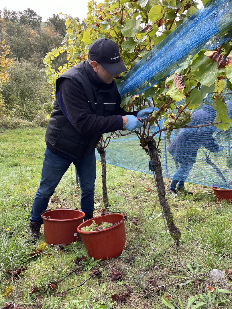 Heute haben wir die Weinlese 2024 mit dem Bacchus begonnen. Bei schönstem Wetter haben wir mit einem kleinen Team die Bacchus Trauben nach Hause gebracht. Wir konnten uns über eine sehr gute Qualität bei einer leider sehr kleinen Menge freuen. Der späte Frost im April hat uns hier leider um einen Großteil der Ernte gebracht.